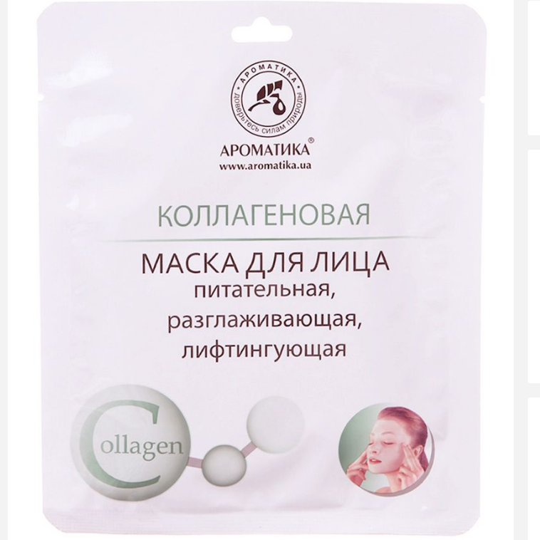Биоцеллюлозная лифтинг-маска для лица «Коллаген» Ароматика оказывает питательный, разглаживающий и лифтингующий эффект. Маска на основе коллагена – это действенный косметический способ борьбы с преждевременным увяданием кожи лица. Уникальная ухаживающая формула средства основана на натуральных растительных экстрактах, которые бережно заботятся о коже, укрепляют её и продлевают молодость. Маска, благодаря своему действенному составу, позволяет подтянуть кожу, разгладить мимические морщины и предупреждает образование новых. Она питает, увлажняет, активизирует обмен веществ в тканях. Данная маска будет полезной для восстановления кожи после курса пилингов.