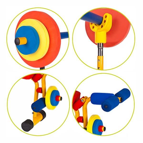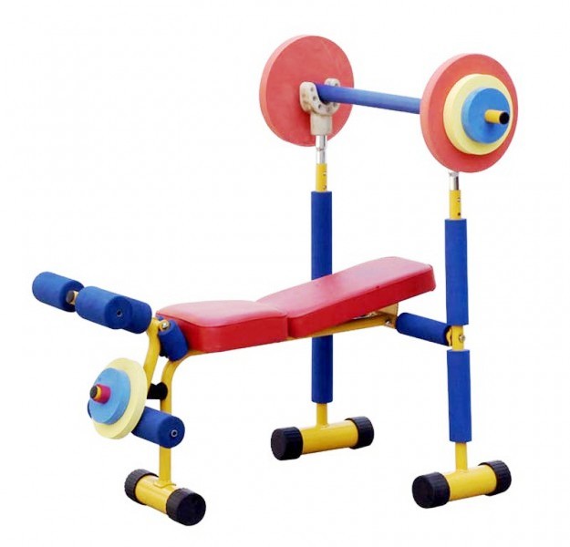 Эргономика тренажера специально разрабатывалась для детей. Имеет прочную и устойчивую конструкцию. Стойки имеют регулировку вылета. Диски (веса) штанги выполнены из полиуретана, что делает тренировки безопасными.