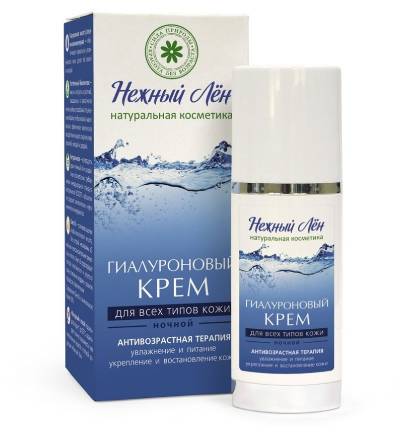 Ночной гиалуроновый крем «Нежный лен» входит в антивозрастную программу компании. Этот крем осуществляет комплексный уход, питание и омоложение зрелой кожи всех типов, восстанавливает кожу после пребывания на солнце, снимает раздражение, красноту.