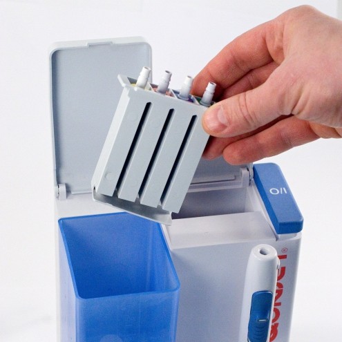 Склонитесь над раковиной. Поднесите кончик насадки к Вашим зубам или деснам, пустите струю выключателем подачи воды, расположенным на ручке ирригатора. Постепенно увеличивая напор струи, определите, какой подходит именно вам. Начинать лучше с самого низкого напора (позиция 1 регулятора напора струи).