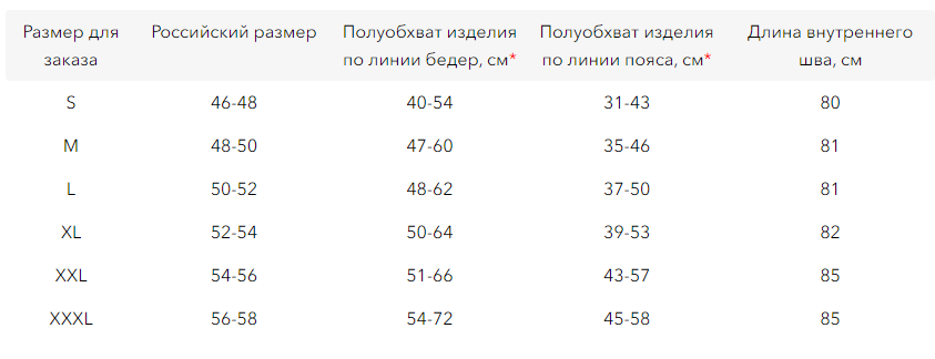 *Параметры изделия в спокойном и растянутом до комфортного натяжения состоянии. Подберите размер таким образом, чтобы ваши мерки находились в указанном диапазоне параметров изделия.