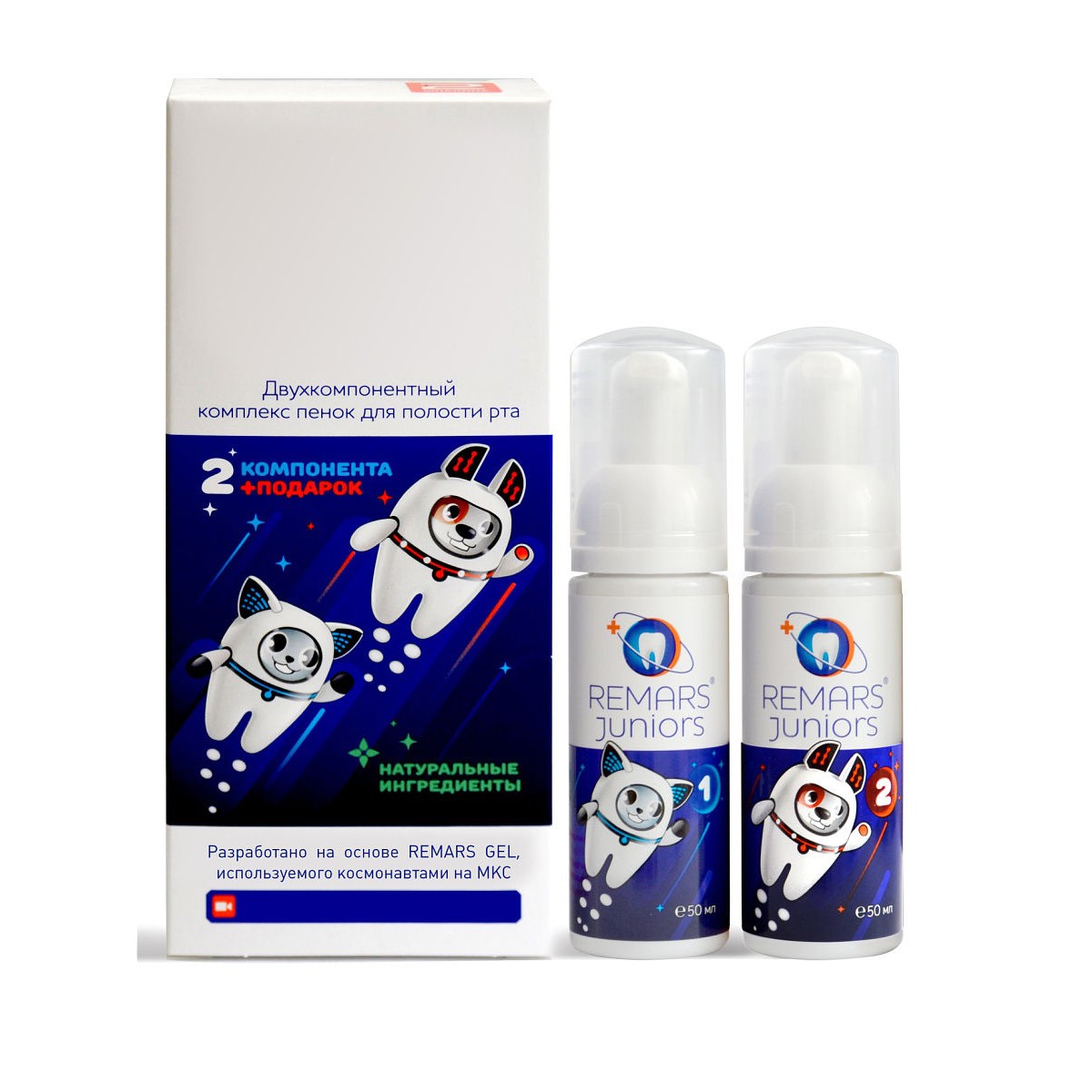 Последняя разработка Remars Technology, новинка 2018 года. Remars Juniors — это двухкомпонентный комплекс пенок для полноценного ухода за полостью рта детей от 6 лет и взрослых. Регулярное применение комплекса восстанавливает и укрепляет эмаль, эффективно предотвращает кариес и даже устраняет кариес на стадии "белого пятна".