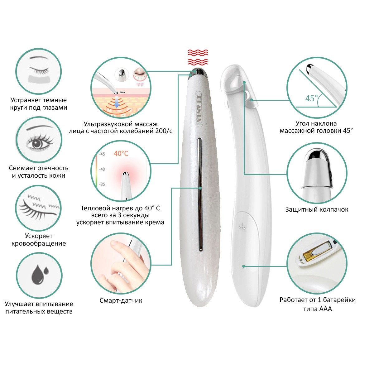 Воздействие осуществляется за счет передачи ультразвуковых колебаний массажной головкой прибора через тонкий слой воды или косметического средства на поверхность кожи. Кожа вокруг глаз значительно тоньше всей остальной кожи и содержит всего 3-5 рядов клеток эпидермиса, к тому же ежедневно она подвергается негативным воздействиям таким, как активная мимика, моргание, нанесение и снятие макияжа, трение глаз, длительная работа за компьютером, недостаток сна, несбалансированное питание, вредные привычки, солнечный свет.