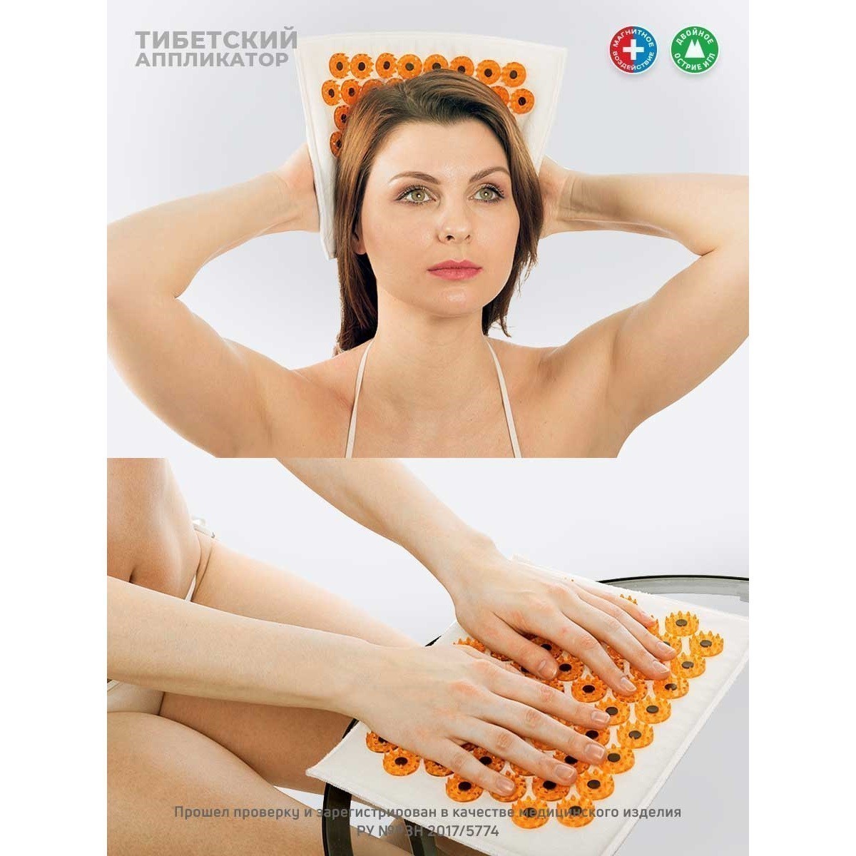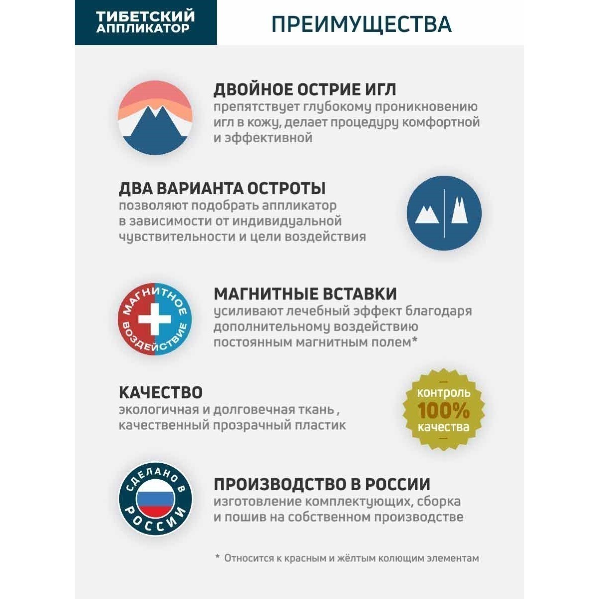 Тибетский аппликатор на мягкой подложке 17 x 28 см прижимается к поверхности кожи руками или с помощью веса тела. Возможно прижатие эластичным поясом или бинтом.