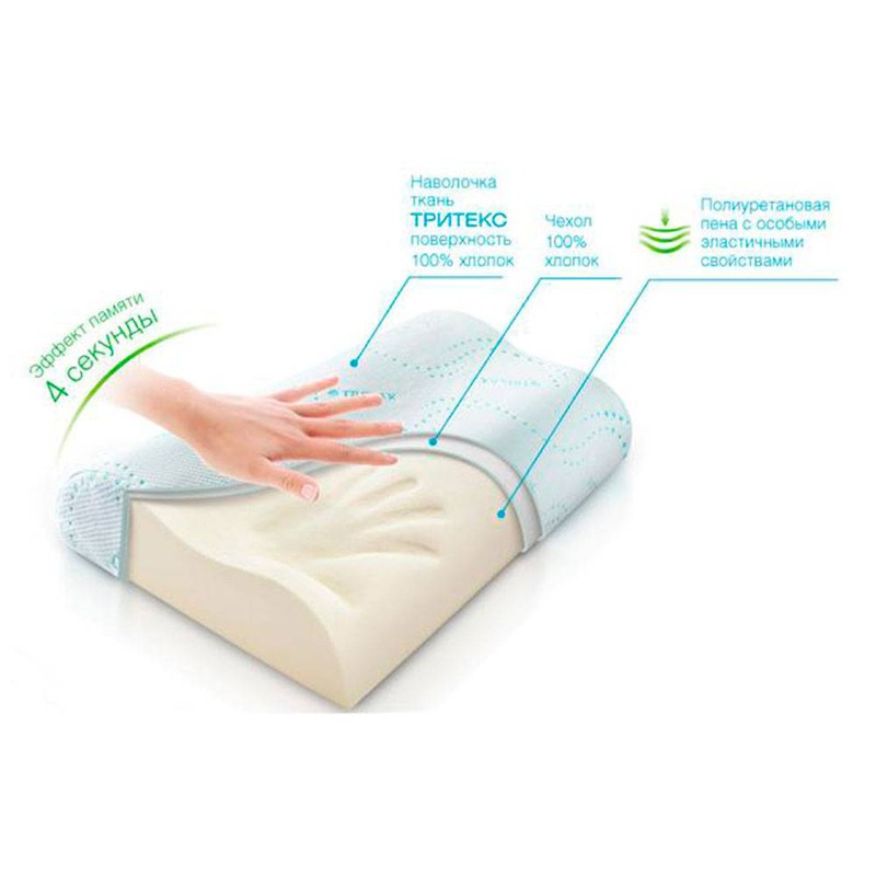 основа - вязкоэластичный пенополиуретан с ионами серебра чехол - 100% хлопок наволочка - 35% лиоцелл -TENCEL® (поверхность), 65% полиэстер |