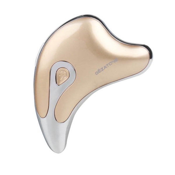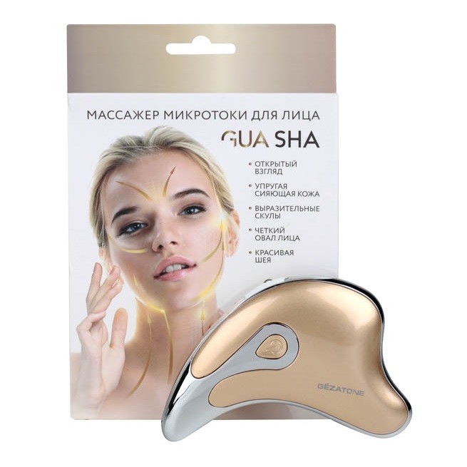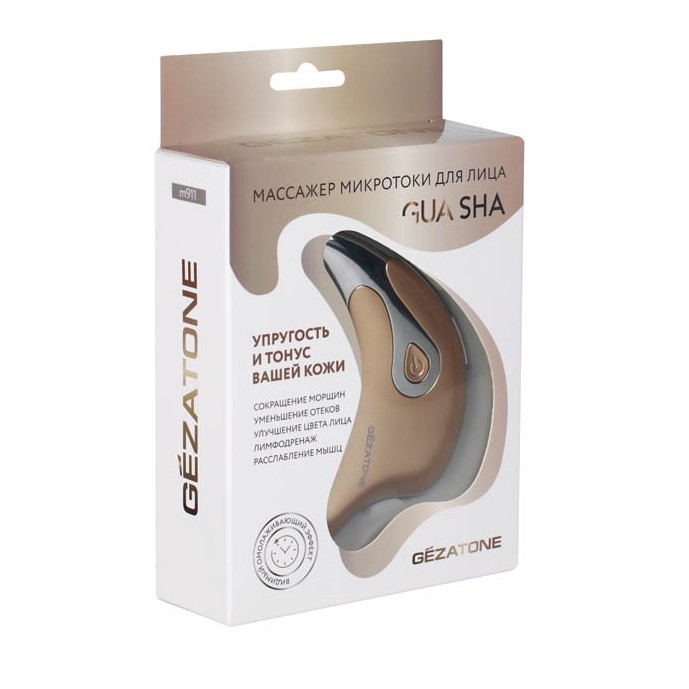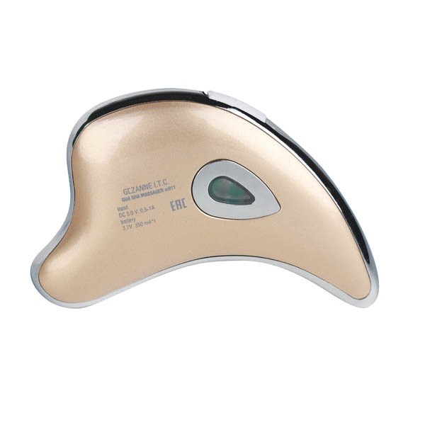 Оригинальный портативный прибор Gezatone m 911 Gua Sha для комплексного ухода за кожей лица и шеи с использованием профессиональных методик: ионофореза, вибрационного массажа и глубокого прогрева тканей, выполнен в форме инструмента, используемого для косметического массажа гуаша.