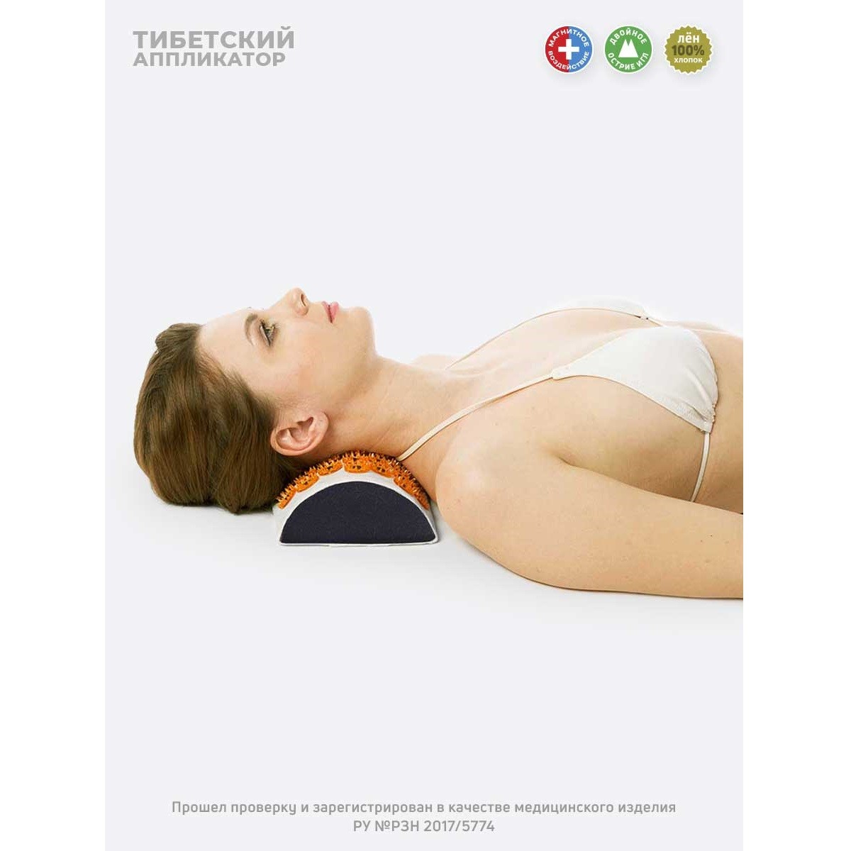 Тибетский аппликатор мягкий валик для шеи кладут на горизонтальную поверхность (например, на кровать или на пол), затем на него ложатся, обеспечивая колющее воздействие в области шеи с помощью веса тела.